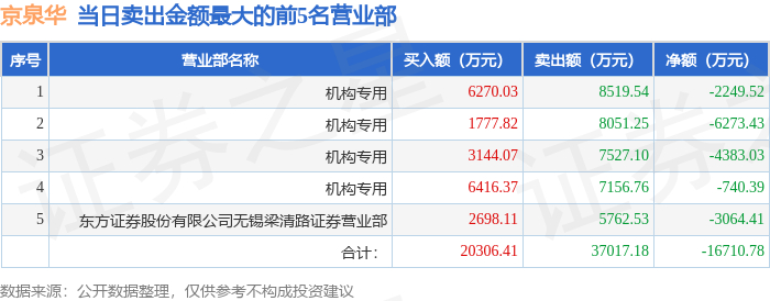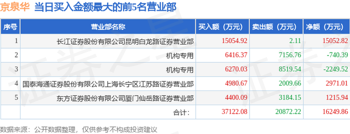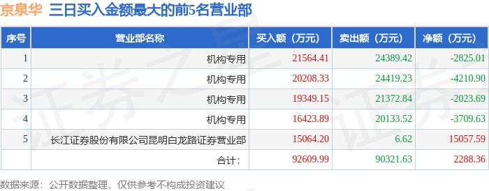 11月7日京泉华(002885)龙虎榜数据:机构净卖出1.36亿元
