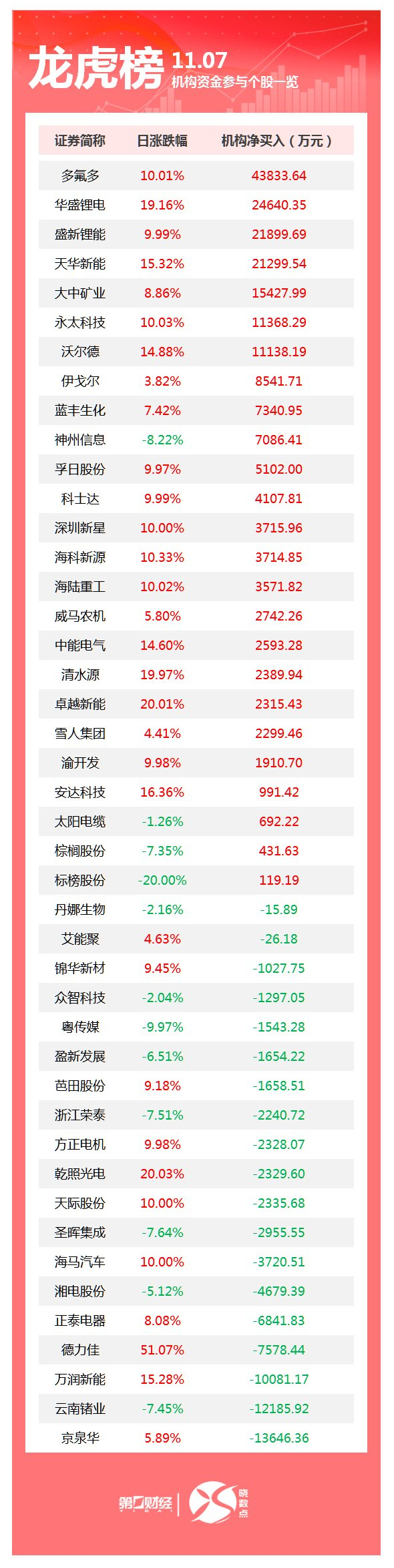 当天机构净买入前三的股票分别是多氟多、华盛锂电、盛新锂能,净买入金额分别是4.38亿元、2.46亿元、2.19亿元。