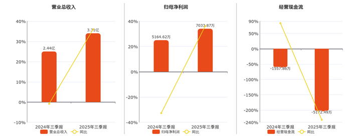 公司营业总收入为3.31亿元。归母净利润为7033.87万元。经营活动现金净流入为-5172.49万元,较去年同报告期经营活动现金净流入减少3614.62万元。