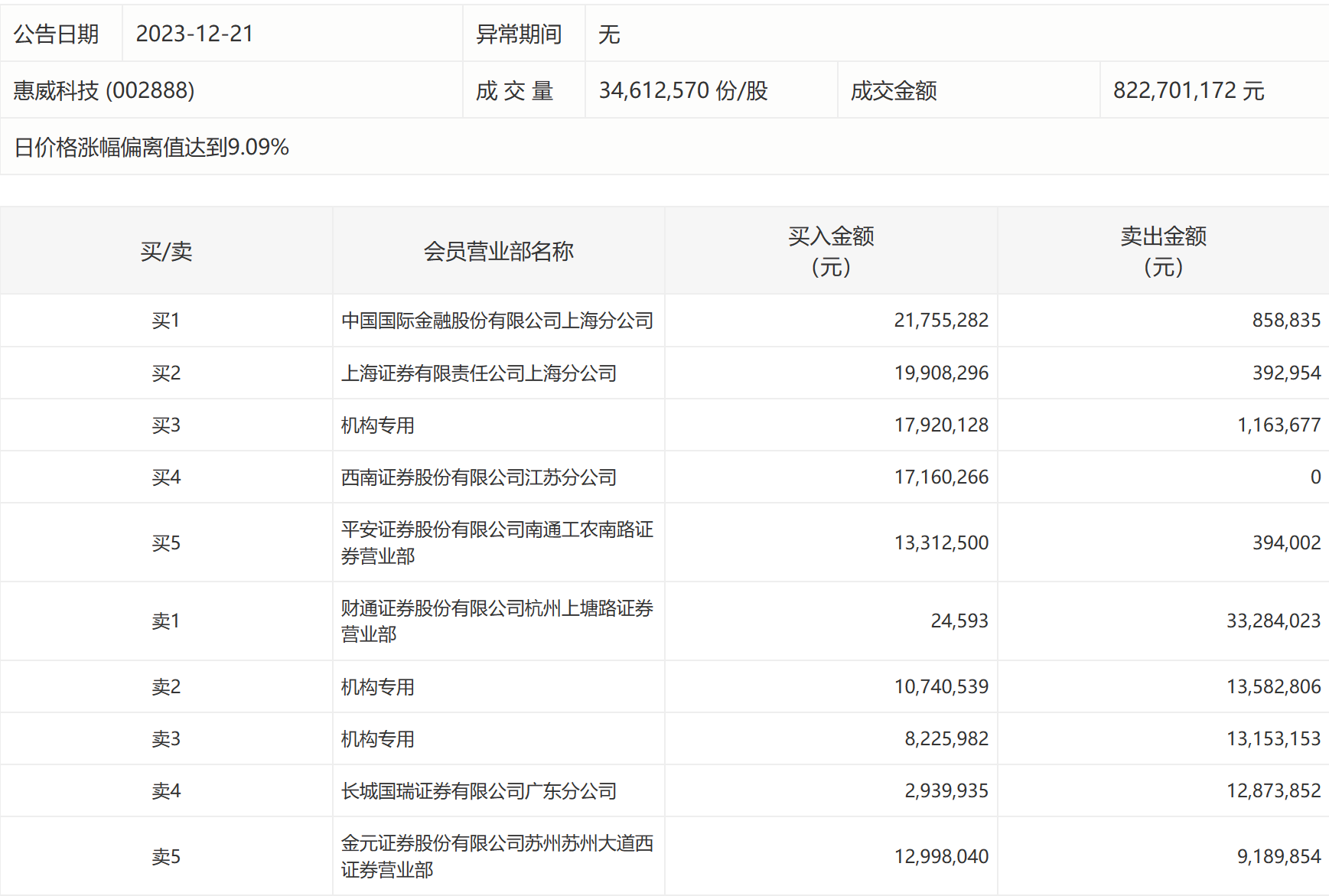 12月21日,惠威科技今日涨停,全天换手率达45.78%,振幅达18.19%。龙虎榜数据显示,营业部席位合计净买入4009.24万元。其中,机构买入3688.66万元,卖出2789.96万元,合计净买入898.7万元。此外,中国国际金融上海分公司、上海证券上海分公司分别买入2175.53万元、1990.83万元;财通证券杭州上塘路证券营业部、长城国瑞证券有限公司广东分公司分别卖出3328.40万元、1287.39万元。
