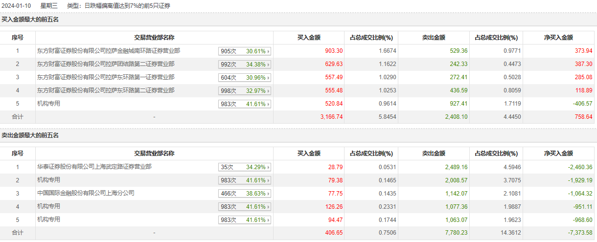 惠威科技1月10日跌停,全天换手率达31.96%,振幅达13.36%。龙虎榜数据显示,营业部席位合计净卖出6614.94万元。其中,机构买入820.95万元,卖出5076.41万元,合计净卖出4255.46万元。此外,华泰证券上海武定路证券营业部、中国国际金融上海分公司分别卖出2489.16万元、1142.07万元;东方财富证券拉萨金融城南环路证券营业部、东方财富证券拉萨团结路第二证券营业部分别买入903.30万元、629.63万元。