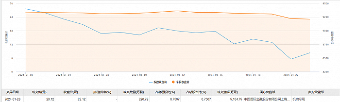 1月23日大宗交易成交220.79万股,成交额5104.75万元,占当日总成交额的43.46%,成交价23.12元,较市场收盘价持平。