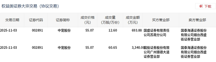 11月3日,中宠股份大宗交易成交73.25万股,成交额4033.88万元,占当日总成交额的8.86%,成交价55.07元,较市场收盘价57.97元折价5%。