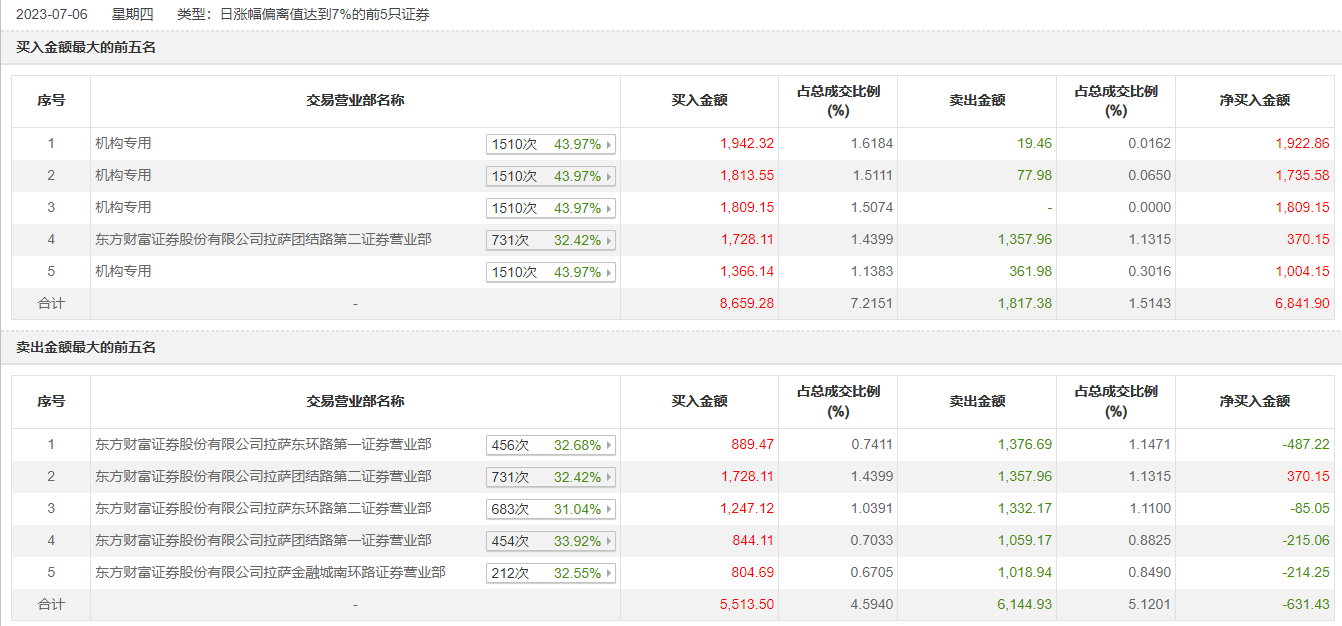 具体来看,机构买入6931.17万元,卖出459.42万元,合计净买入6471.74万元。此外,东方财富证券拉萨团结路第二证券营业部、东方财富证券拉萨东环路第二证券营业部分别买入1728.11万元、1247.12万元;东方财富证券拉萨东环路第一证券营业部、东方财富证券拉萨团结路第二证券营业部分别卖出1376.69万元、1357.96万元。