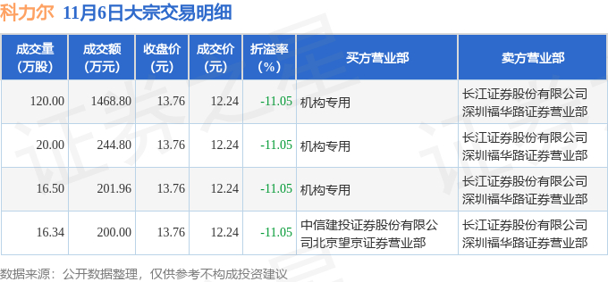 11月6日科力尔现4笔折价11.05%的大宗交易 合计成交2115.56万元