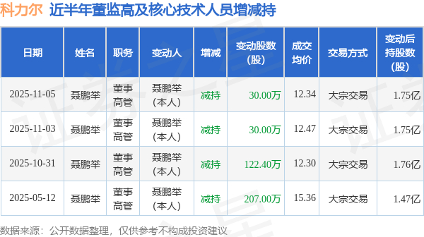 科力尔:11月5日高管聂鹏举减持股份合计30万股