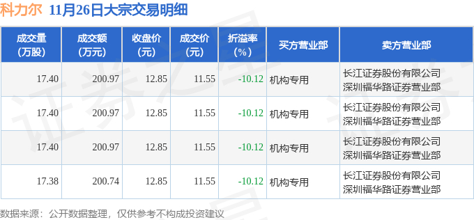 11月26日科力尔现4笔折价10.12%的大宗交易 合计成交803.65万元