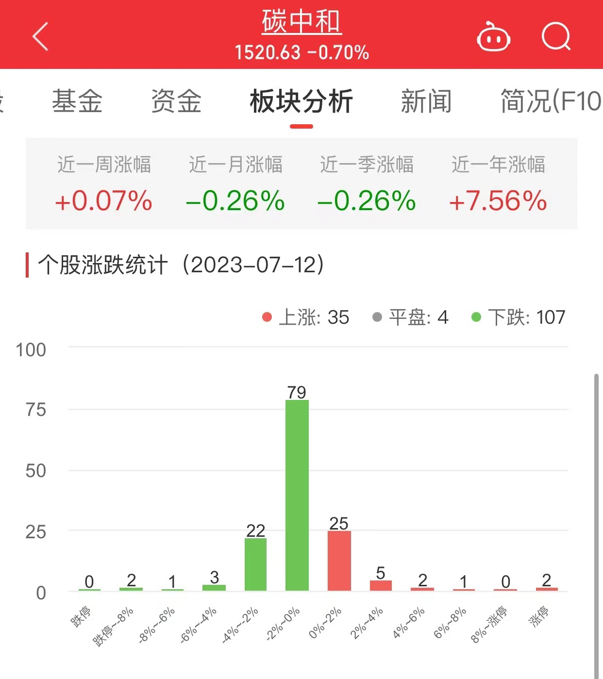 中国经济网北京7月12日讯 今日,碳中和板块整体跌幅0.70%,其中35只股票上涨,4只股票平盘,107只股票下跌。