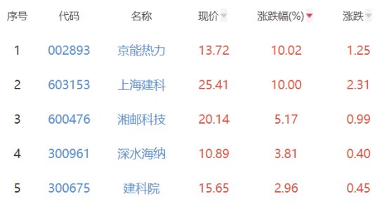 其中,京能热力、上海建科、湘邮科技、深水海纳、建科院位列板块涨幅榜前五位,涨幅分别为10.02%、10.00%、5.17%、3.81%、2.96%。