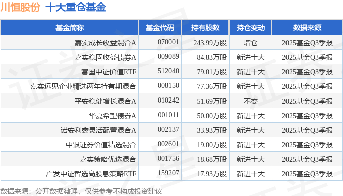 持有川恒股份最多的基金为嘉实成长收益混合A,目前规模为17.86亿元,最新净值1.3655(10月30日),较上一交易日下跌0.34%,近一年上涨21.12%。该基金现任基金经理为方晗。