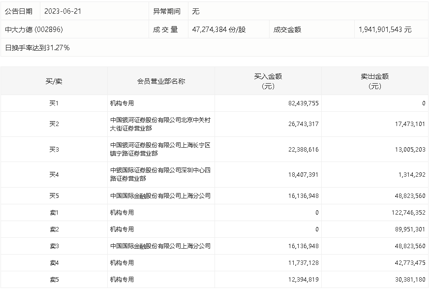6月21日,中大力德今日跌3.69%,龙虎榜数据显示,上榜营业部席位全天成交5.57亿元,占当日总成交金额比例为28.67%。其中,买入金额为1.9亿元,卖出金额为3.66亿元,合计净卖出1.76亿元。
