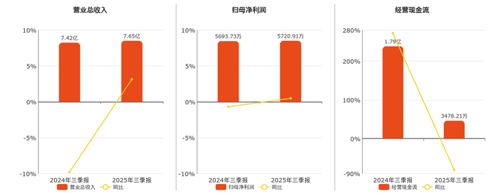 公司营业总收入为7.65亿元。归母净利润为5720.91万元。经营活动现金净流入为3478.21万元,较去年同报告期经营活动现金净流入减少1.44亿元,同比较去年同期下降80.59%。