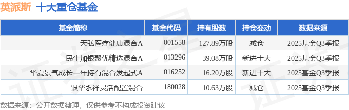 持有英派斯最多的基金为天弘医疗健康混合A,目前规模为2.63亿元,最新净值1.7813(10月31日),较上一交易日上涨3.43%,近一年下跌6.15%。该基金现任基金经理为吕俏。