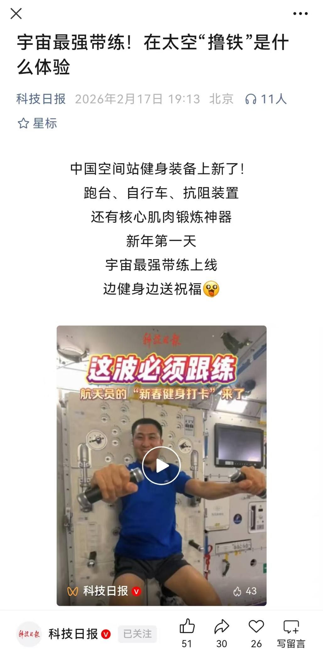 青岛日报社/观海新闻2月23日讯 “预祝大家在新的一年里,把幸福生活推向新高度!”今年春节,航天员们在中国空间站一边熟练地进行卷腹、推举,一边通过视频向祖国人民拜年的画面,经由《人民日报》《科技日报》等媒体传播,让亿万国人感受到了太空中的年味与活力。而这组火爆全网的视频中,太空健身房中最亮眼的“明星设备”是“青岛造”。