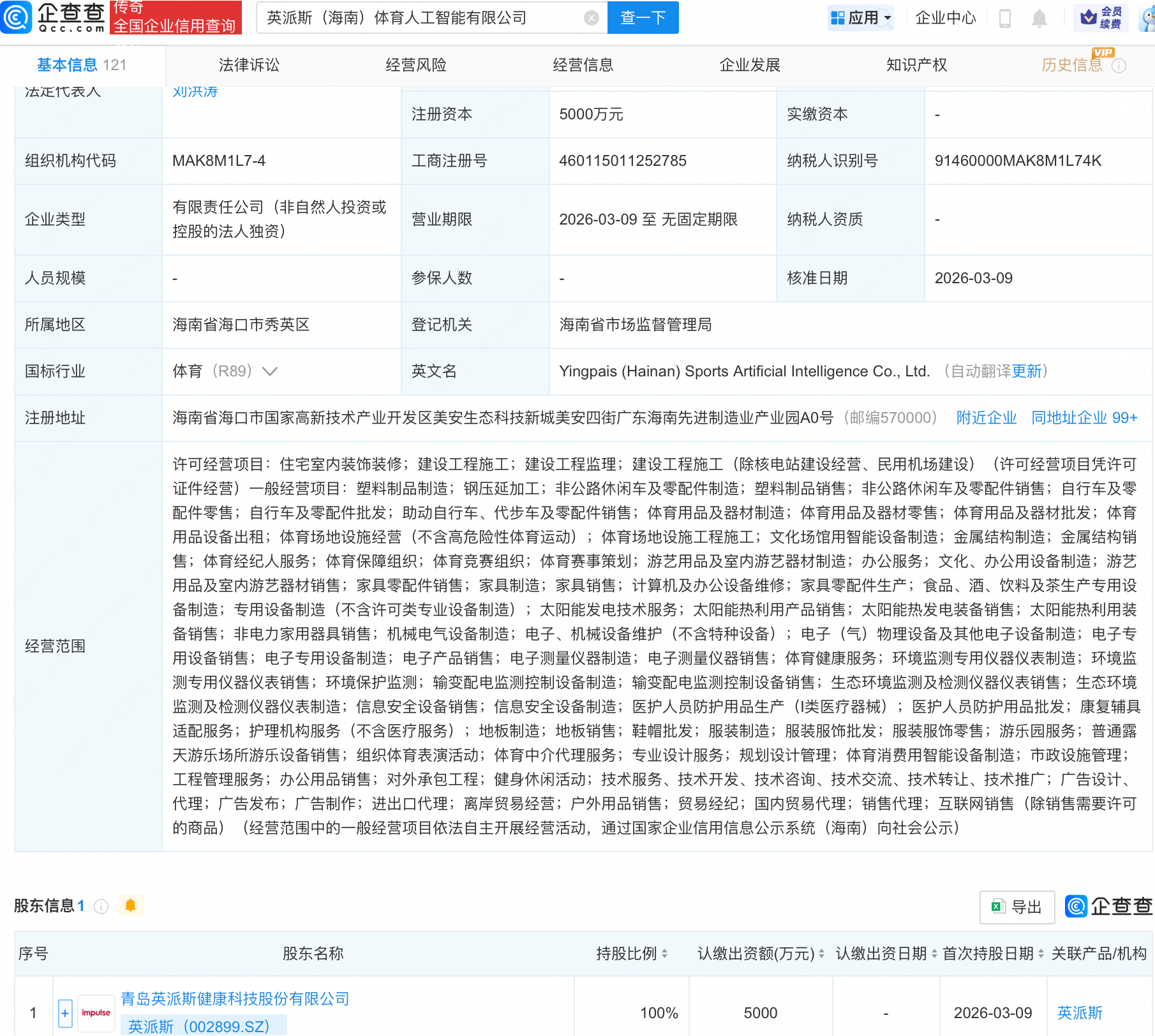 企查查APP显示,近日,英派斯(海南)体育人工智能有限公司成立,注册资本5000万元,经营范围包含:生态环境监测及检测仪器仪表销售;生态环境监测及检测仪器仪表制造;信息安全设备销售;信息安全设备制造等。企查查股权穿透显示,该公司由英派斯(002899.SZ)全资持股。