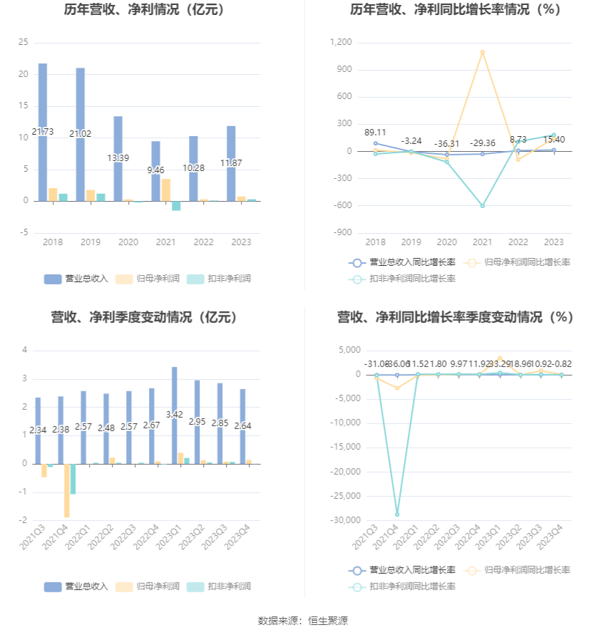 2023年,公司经营活动现金流净额为3569.36万元,同比下降75.32%;筹资活动现金流净额-1508.19万元,同比增加9203.90万元;投资活动现金流净额-2.61亿元,上年同期为4.19亿元。