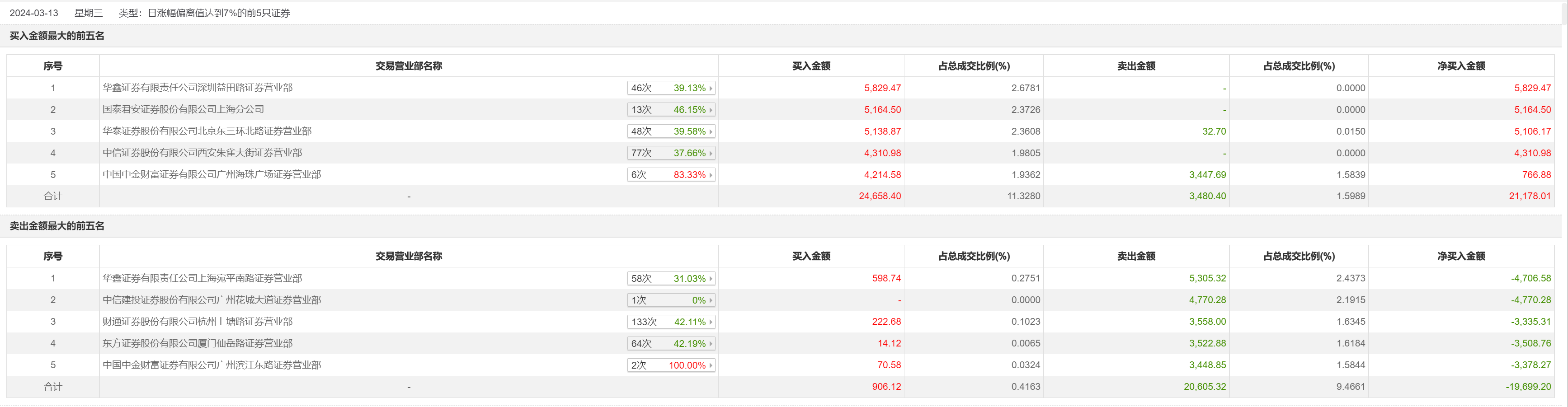 3月13日,铭普光磁今日涨停,龙虎榜数据显示,上榜营业部席位全天成交4.97亿元,占当日总成交金额比例为22.81%。其中,买入金额为2.56亿元,卖出金额为2.41亿元,合计净买入1478.8万元。