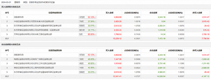 具体来看,知名游资现身龙虎榜,深股通专用、方新侠(中信证券西安朱雀大街证券营业部)分别买入4858.66万元、3925.26万元;深股通专用、海通证券南京广州路证券营业部分别卖出3344.19万元、3177.46万元。