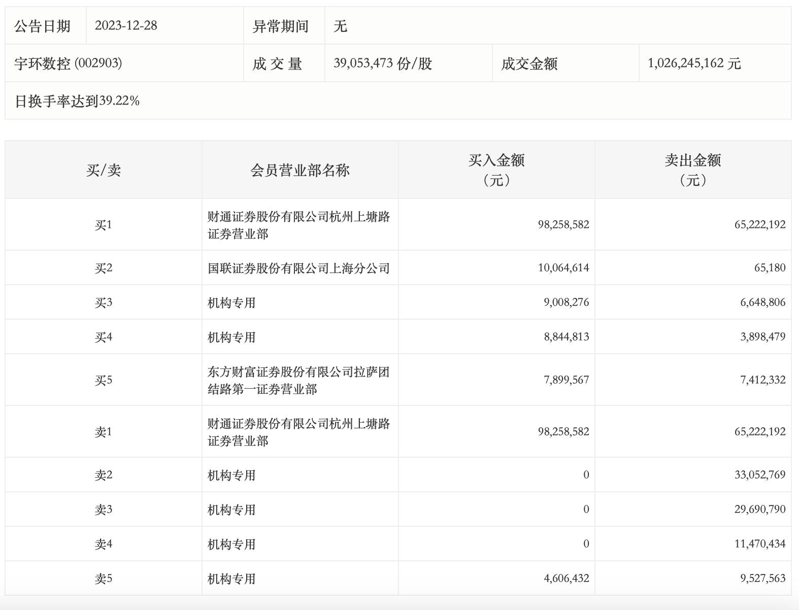 龙虎榜丨宇环数控今日涨3.13%,四机构净卖出7913.51万元