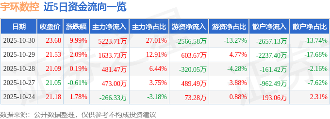 10月30日的资金流向数据方面,主力资金净流入5223.71万元,占总成交额27.01%,游资资金净流出2566.58万元,占总成交额13.27%,散户资金净流出2657.13万元,占总成交额13.74%。