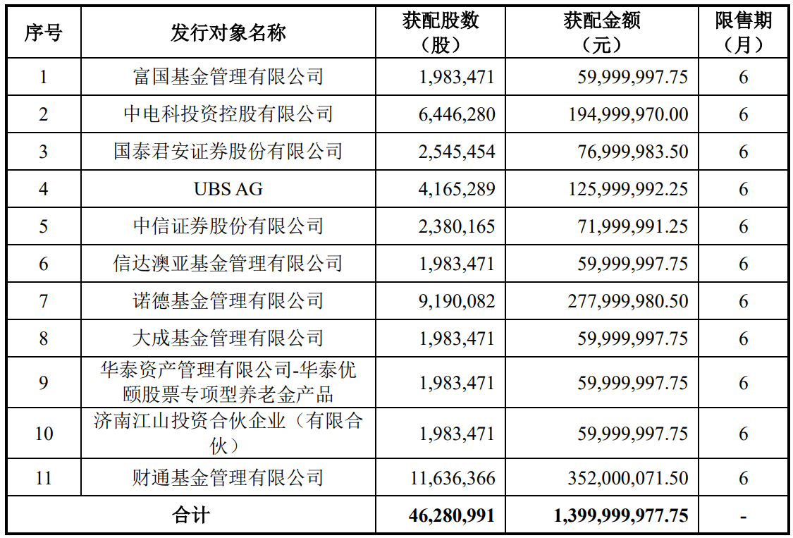 8月10日公告,本次发行价格30.25元/股,发行股数4628.09万股,募集资金总额14.00亿元。财通基金获配3.52亿元,诺德基金获配2.78亿元,UBS AG获配1.26亿元。