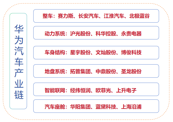华为汽车产业链上有赛力斯、北汽蓝谷、星宇股份、立讯精密、沪光股份、上声电子、拓普集团、华阳集团、宁德时代等。
