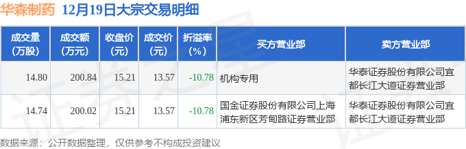 12月19日华森制药现2笔折价10.78%的大宗交易 合计成交400.86万元