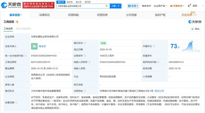 雷达财经讯,天眼查App显示,近日,甘肃农垦乳业研究有限公司成立,法定代表人为陶生俭,注册资本1000万人民币,经营范围包括乳制品生产、生鲜乳收购、饮料生产、食品销售、食品经营管理等。股东信息显示,该公司由庄园牧场(002910)全资持股。