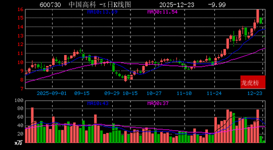 截止收盘,中国高科报收12.89元/股,涨幅-9.99%,成交量4万手,成交额0.60亿元,换手率0.8%。今日未涨停。
