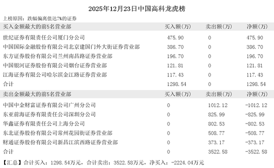 买入前5席为:世纪证券有限责任公司厦门分公司、中国国际金融股份有限公司北京建国门外大街证券营业部、东方证券股份有限公司兰州南昌路证券营业部、中国银河证券股份有限公司烟台证券营业部、江海证券有限公司哈尔滨金江路证券营业部。共计买入:1298.54万元,共计卖出:0万元。