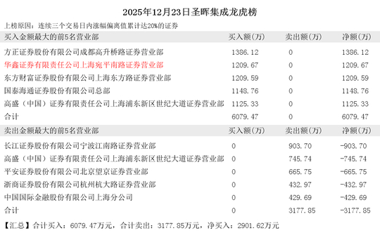 买入前5席为:方正证券股份有限公司成都高升桥路证券营业部、华鑫证券有限责任公司上海宛平南路证券营业部、东方财富证券股份有限公司上海东方路证券营业部、国泰海通证券股份有限公司总部、高盛(中国)证券有限责任公司上海浦东新区世纪大道证券营业部。共计买入:6079.47万元,共计卖出:0万元。