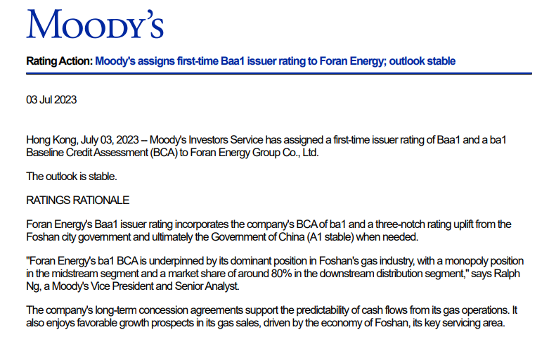 2023年,公司成功获得穆迪Baa1、惠誉BBB+双国际投资级评级,成为佛山市首家获得穆迪、惠誉“双投资级”的国有企业。此次东方金诚AAA主体信用等级是对公司经营实力、偿债能力与发展前景的再次高度认可,构建起“国际+国内”高信用体系,进一步夯实了公司在资本市场的核心竞争力。