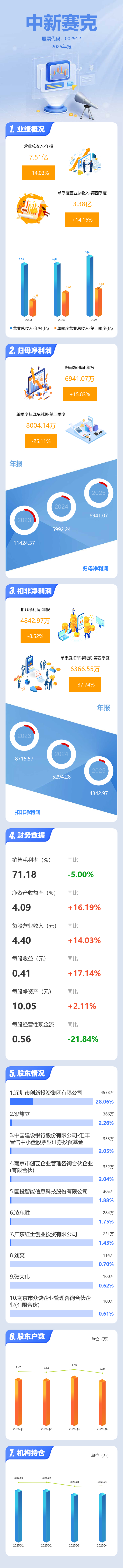 证券之星消息,中新赛克2025年年报显示,当年度公司主营收入7.51亿元,同比上升14.03%;归母净利润6941.07万元,同比上升15.83%;扣非净利润4842.97万元,同比下降8.52%;其中2025年第四季度,公司单季度主营收入3.38亿元,同比上升14.16%;单季度归母净利润8004.14万元,同比下降25.11%;单季度扣非净利润6366.55万元,同比下降37.74%;负债率19.49%,投资收益762.7万元,财务费用-1626.67万元,毛利率71.18%。