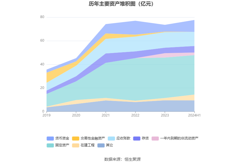 资产重大变化方面,截至2024年上半年末,公司货币资金较上年末增加75.16%,占公司总资产比重上升5.18个百分点;在建工程较上年末增加145.30%,占公司总资产比重上升3.57个百分点;固定资产较上年末减少2.34%,占公司总资产比重下降3.51个百分点;应收账款较上年末减少9.25%,占公司总资产比重下降2.52个百分点。