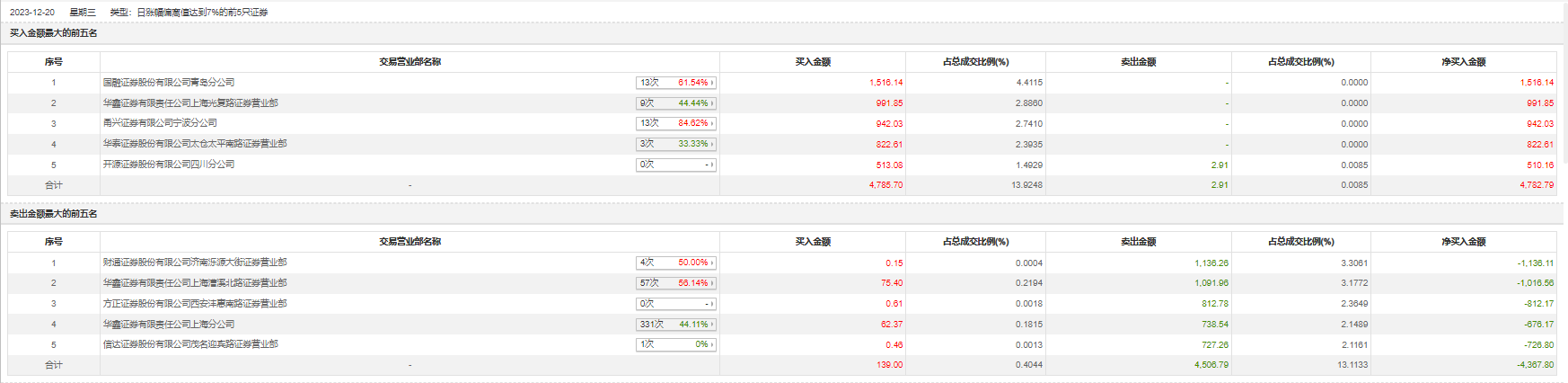 12月20日,中欣氟材今日涨停,全天换手率达7.8%,振幅达2.37%。龙虎榜数据显示,营业部席位合计净买入414.99万元。其中,国融证券青岛分公司、华鑫证券上海光复路证券营业部分别买入1516.14万元、991.85万元;财通证券济南泺源大街证券营业部、华鑫证券上海漕溪北路证券营业部分别卖出1136.26万元、1091.96万元。