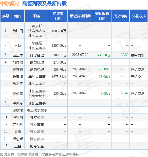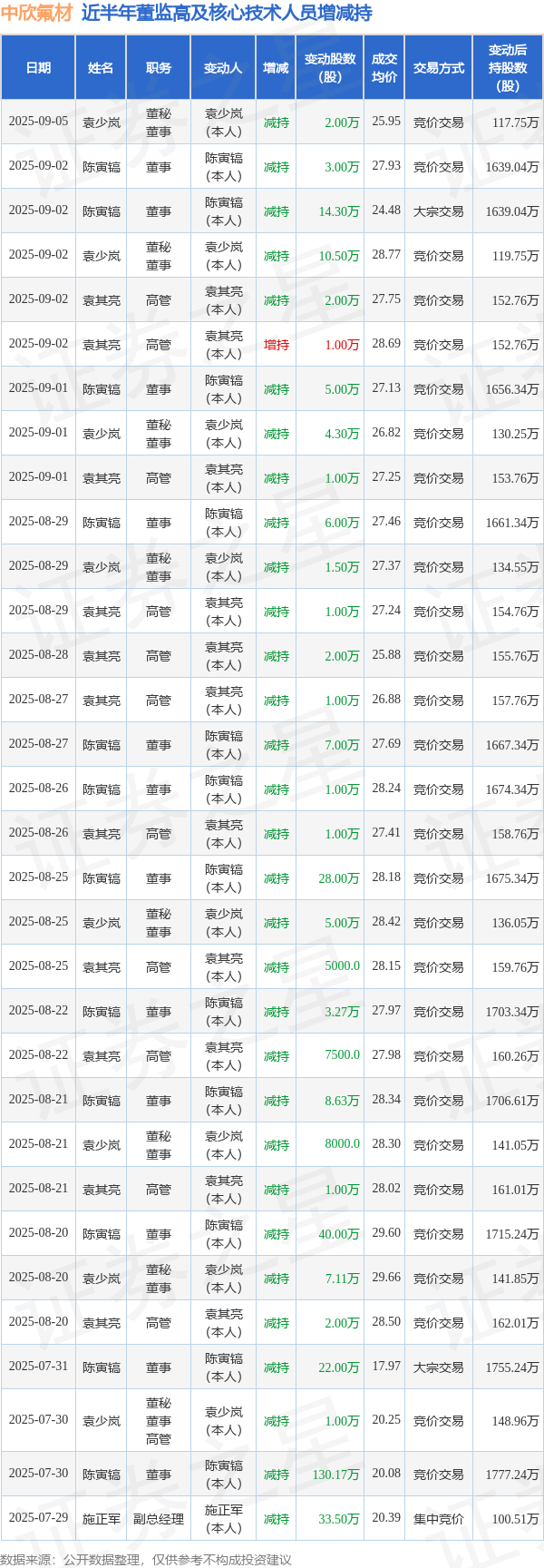 中欣氟材近半年内的董监高及核心技术人员增减持详情如下: