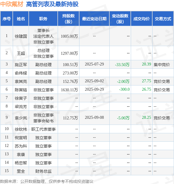 中欣氟材的高管列表及最新持股情况如下: