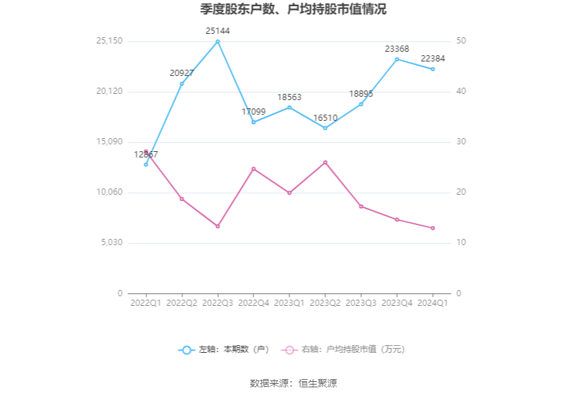 筹码集中度方面,截至2024年一季度末,公司股东总户数为2.24万户,较上年末下降了984户,降幅4.21%;户均持股市值由上年末的14.68万元下降至13.00万元,降幅为11.44%。