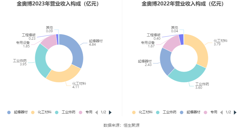 分产品来看,2023年公司主营业务中,起爆器材收入4.84亿元,同比增长99.41%,占营业收入的32.10%;化工材料收入4.11亿元,同比增长8.54%,占营业收入的27.28%;工业炸药收入3.95亿元,同比增长9.73%,占营业收入的26.18%。