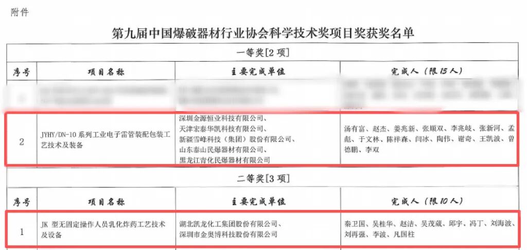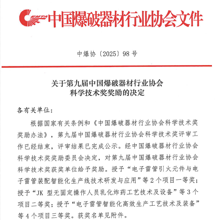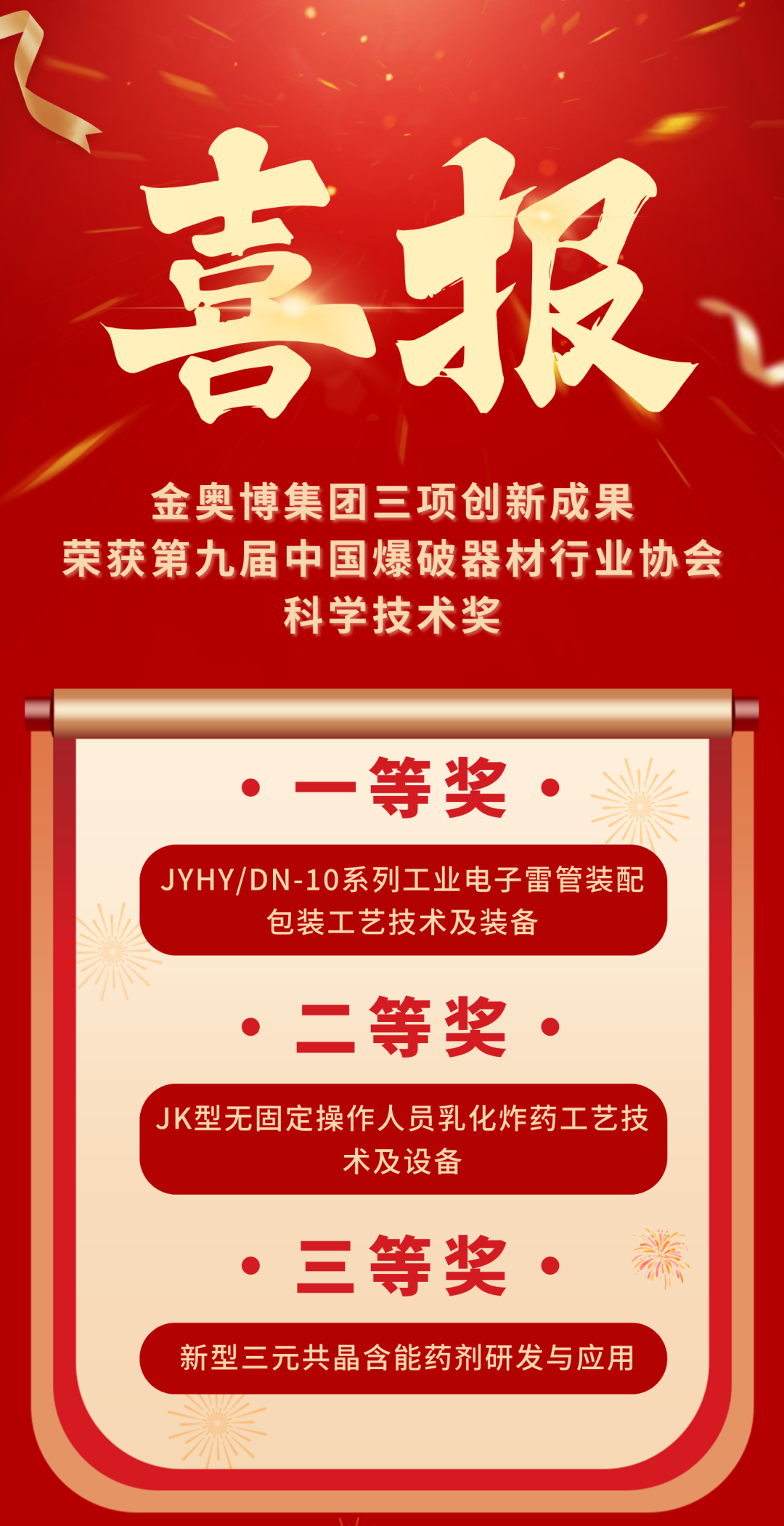 近日,中国爆破器材行业协会正式发布“第九届中国爆破器材行业协会科学技术奖获奖名单”,深圳市金奥博科技股份有限公司(以下简称“金奥博”)及相关下属公司凭借三项技术创新成果在本次评选中脱颖而出——“JYHY/DN-10系列工业电子雷管装配包装工艺技术及装备”项目荣获一等奖、“JK型无固定操作人员乳化炸药工艺技术及设备”项目荣获二等奖、“新型三元共晶含能药剂研发与应用”项目荣获三等奖。