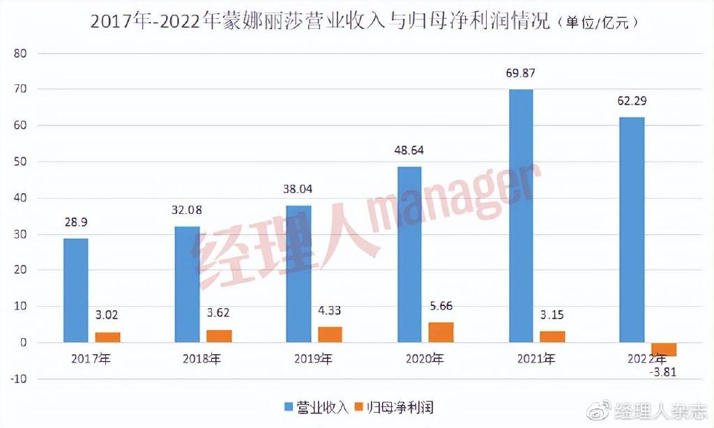 2022年财报显示,蒙娜丽莎实现营业收入62.29亿元,同比下滑10.85%;归母净利润亏损3.81亿元,同比下滑221.13%。这也是蒙娜丽莎自2017年上市以来的首次亏损。