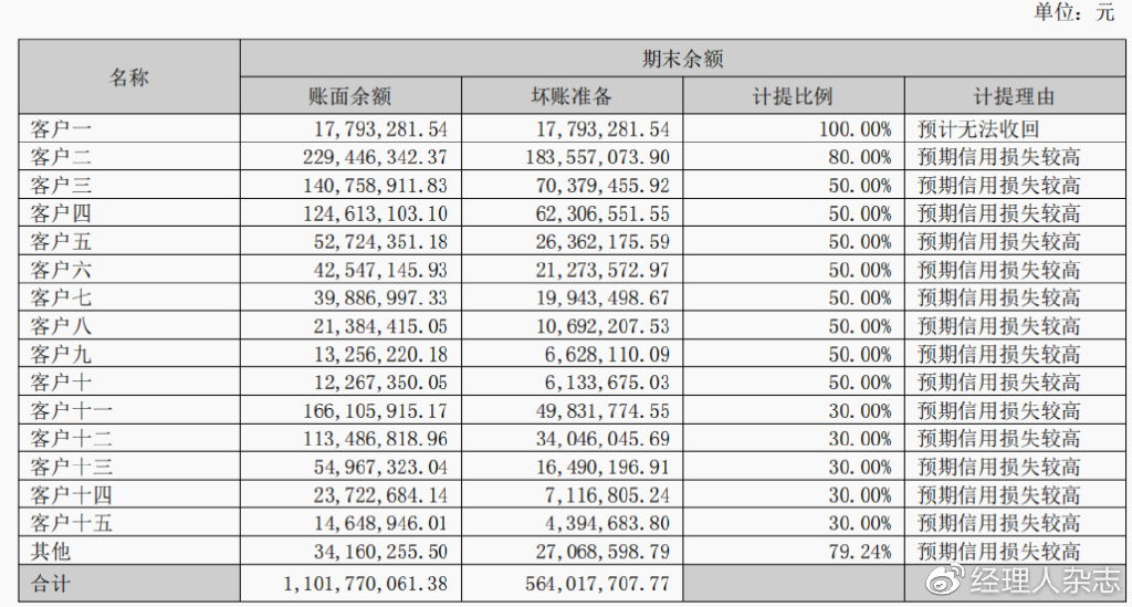 从财报披露的数据来看,蒙娜丽莎对多名客户的应收账款采取了50%以上的计提比例,有的甚至达100%。
