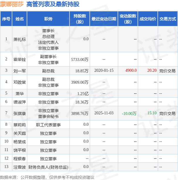 蒙娜丽莎的高管列表及最新持股情况如下: