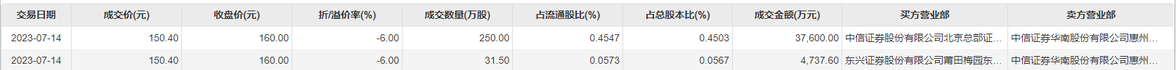 7月14日大宗交易成交281.5万股,成交额4.23亿元,占当日总成交额的20.53%,成交价150.4元,较市场收盘价160元折价6.0%。
