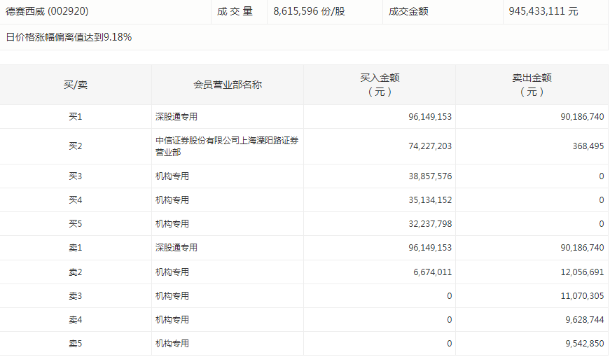 e公司讯,德赛西威今日涨停,成交额9.45亿元。盘后龙虎榜数据显示,深股通专用席位买入9614.92万元并卖出9018.67万元,三机构专用席位净买入1.06亿元,四机构专用席位净卖出3562.46万元。