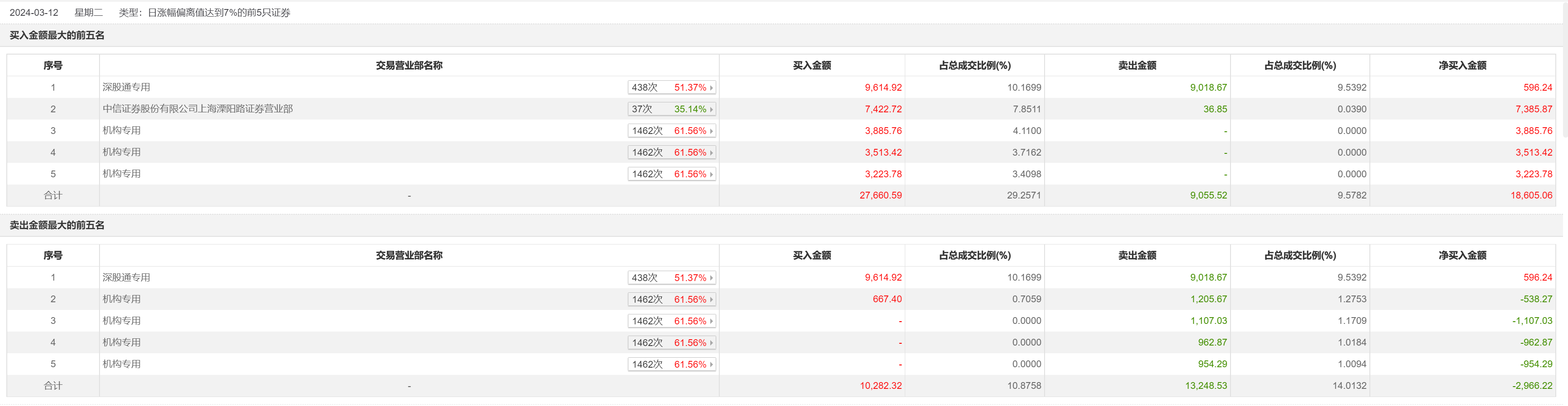 具体来看,机构买入1.13亿元,卖出4229.86万元,合计净买入7060.49万元。此外,知名游资现身龙虎榜,深股通专用、孙哥(中信证券上海溧阳路证券营业部)分别买入9614.92万元、7422.72万元;深股通专用、孙哥(中信证券上海溧阳路证券营业部)分别卖出9018.67万元、36.85万元。