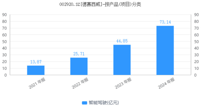 数据显示,2021年-2024年,德赛西威智能驾驶业务营收从13.87亿元大幅攀升至73.14亿元,成为公司增速最快的业务。2025年上半年,德赛西威智能驾驶业务营收占比已经达到28.32%,表明公司已经在智能座舱主业之外成功开辟出第二增长曲线。