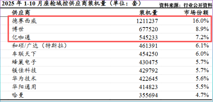 2025年1-10月,德赛西威座舱域控装机量121.12万台,超2024年全年装车量,市占率达16%,高出博世7.1个百分点。