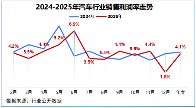 2025年,汽车行业利润率为4.1%,创下近十年新低;其中12月跌至1.8%的历史低值,利润被技术投入、降价、材料成本等因素大规模摊薄。