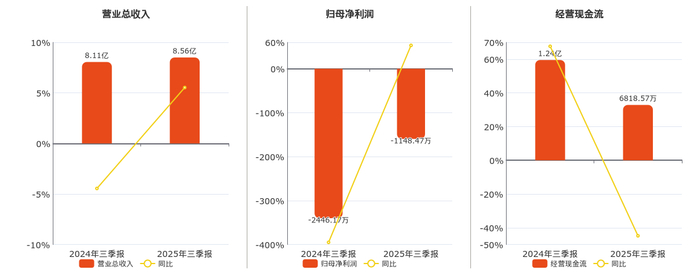公司营业总收入为8.56亿元。归母净利润为-1148.47万元。经营活动现金净流入为6818.57万元,较去年同报告期经营活动现金净流入减少5532.97万元,同比较去年同期下降44.80%。